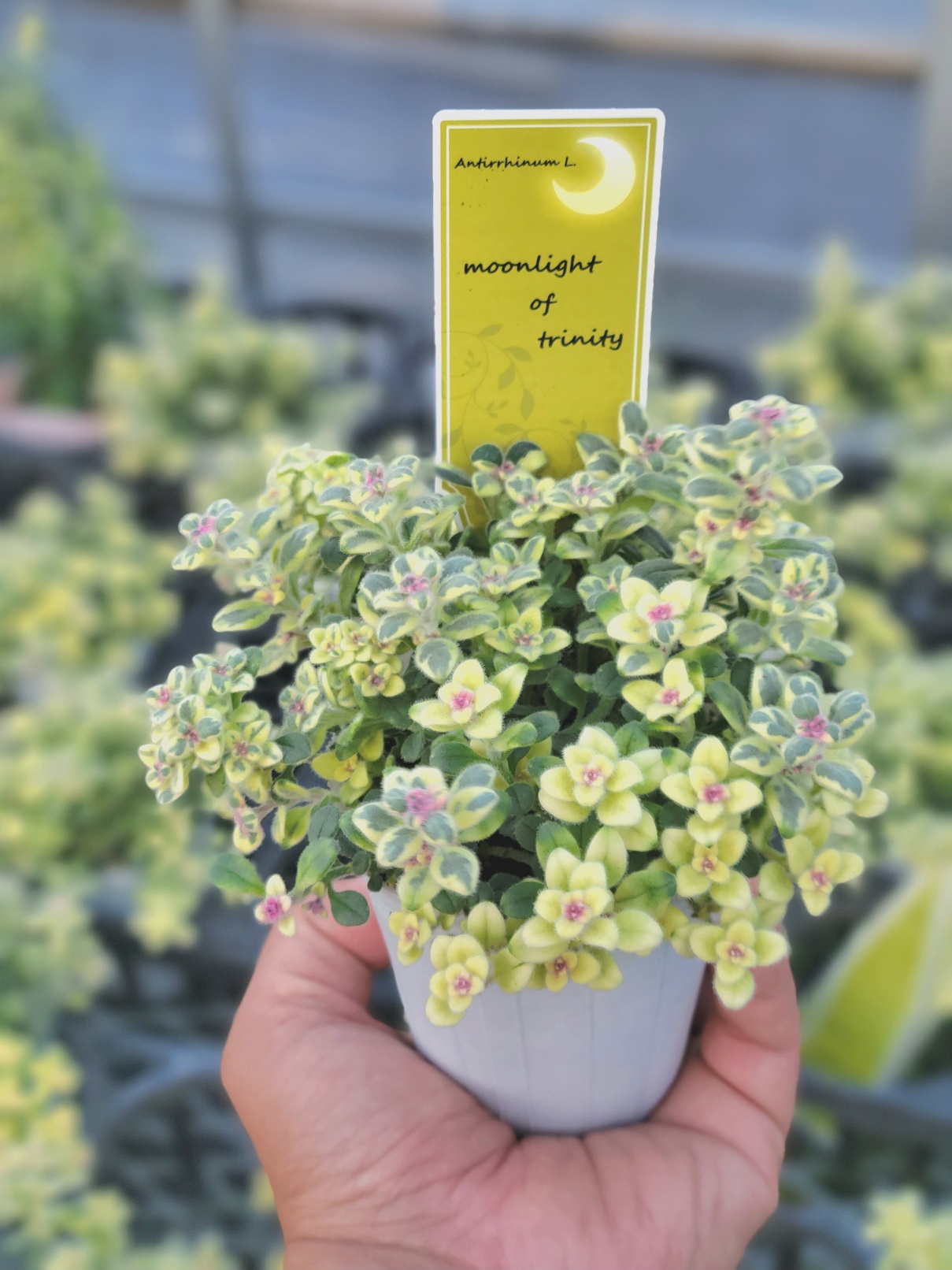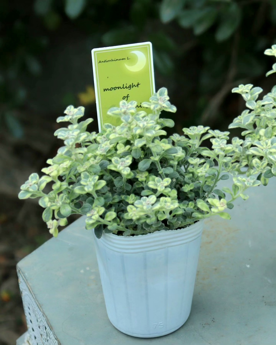 起毛のあるフワフワとした丸葉に月の光のような黄色の斑が可愛いキンギョソウ